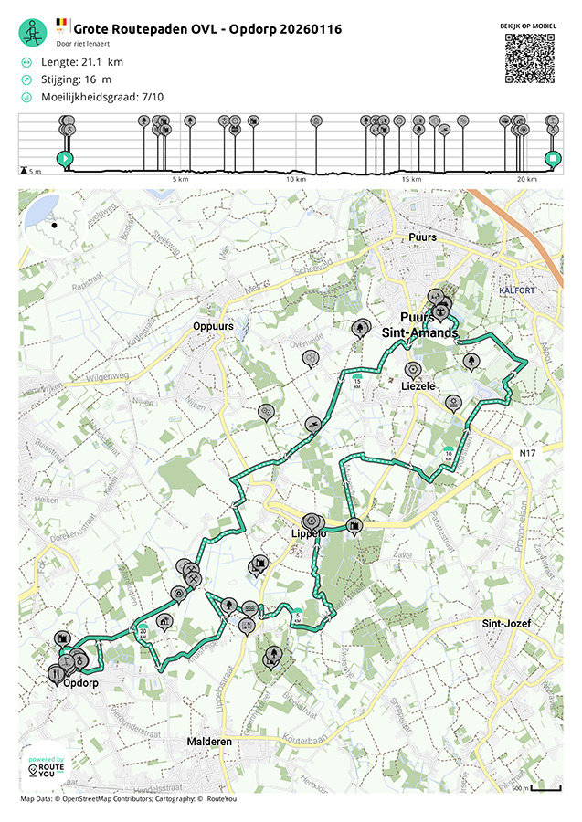 Onze dagwandeling - goed voor zo'n 21km wandelplezier - loopt vanuit Opdorp, over Lippelo en Liezele naar Puurs - Sint-Amands, en terugkeer richting Opdorp waar we langs het Middelpunt van Vlaanderen passeren.